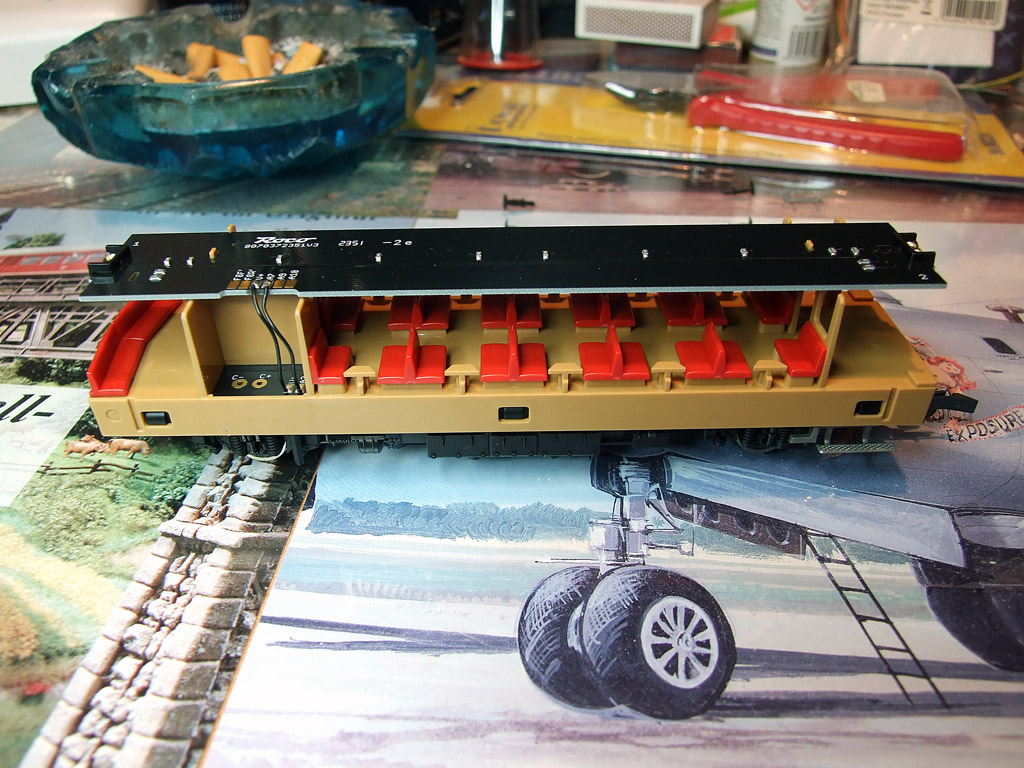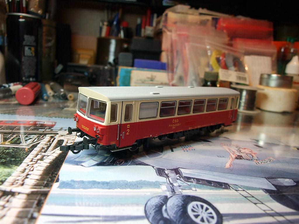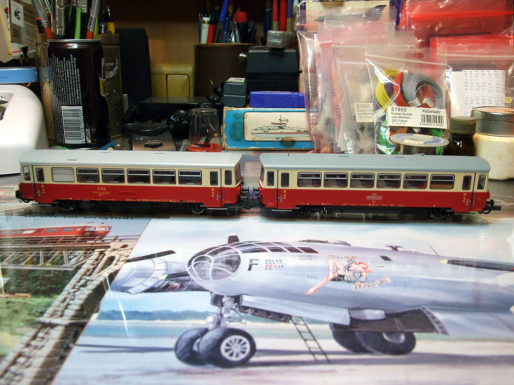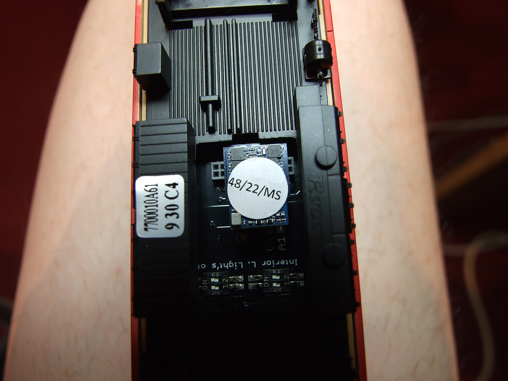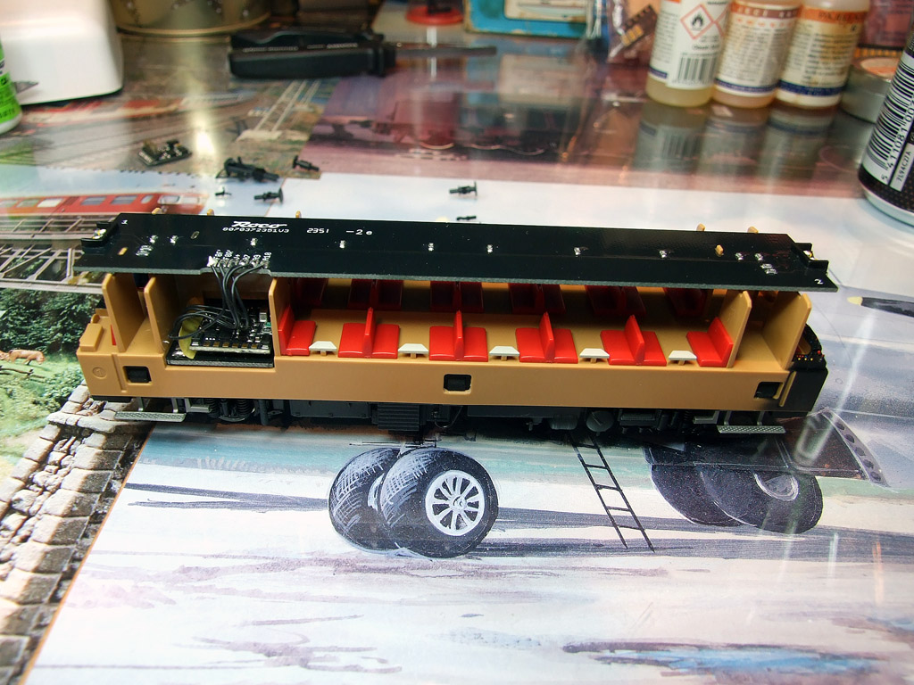 Tentokrát jsem se pustil do ozvučení motorového vozu M152.0262 a přípojného vozu Blm od firmy Roco. Nejdříve je potřeba z karosérie vysunout nárazníky a imitace vzduchových hadic a háků, aby se dala sundat karosérie. Po sundání karosérie jsem musel ze západek uvolnit interiér a odšroubovat spodní plošný spoj od podvozku, ve kterém jsou připraveny otvory s ozvučnicí pro reproduktor. Po přilepení reproduktoru k ozvučnici v podvozku jsem zpět přišrouboval spodní plošný spoj a zacvakl zpět interiér. K ozvučení motorového vozu jsem použil zvukový dekodér Zimo MS450P22 PluX22 / 16bit, který jsem zasunul do připraveného konektoru. Nakonec jsem ještě natřel stolečky pod okny mezi sedačkami světle šedivou barvou Tamiya Deck Tan XF-55. Pak už stačilo jen nasadit karosérii a zajistit ji nárazníky a imitací vzduchových hadic a háků. U přípojného vozu Blm jsem stejným způsobem sundal karosérii jen proto, abych také natřel stolečky pod okny mezi sedačkami světle šedou barvou Tamiya XF-55. U přípojného vozu jsem použil pouze funkční dekodér pro účel osvětlení. Po sundání krytky zespodu podvozku jsem tento dekodér zasunul do připraveného konektoru a krytku zacvakl zpět do podvozku. Tímto bylo ozvučení motorového vozu hotovo. Na výsledek ozvučení se můžete podívat ve videu.