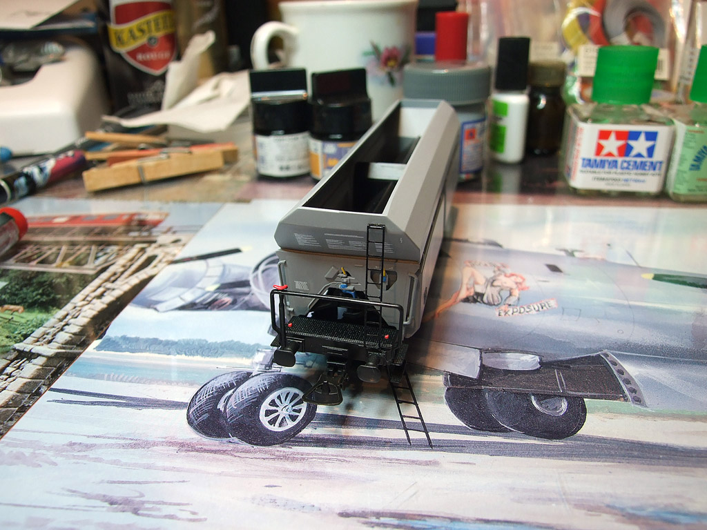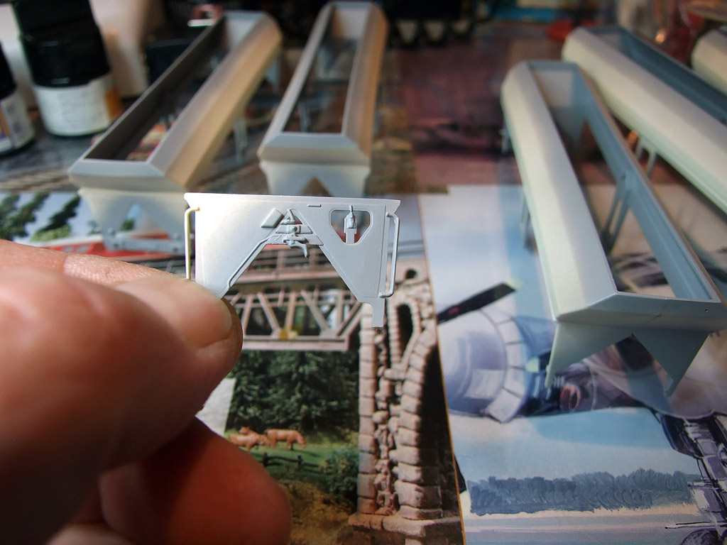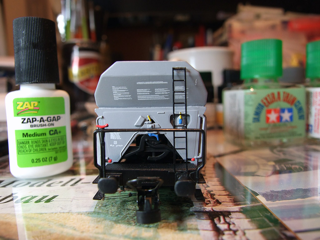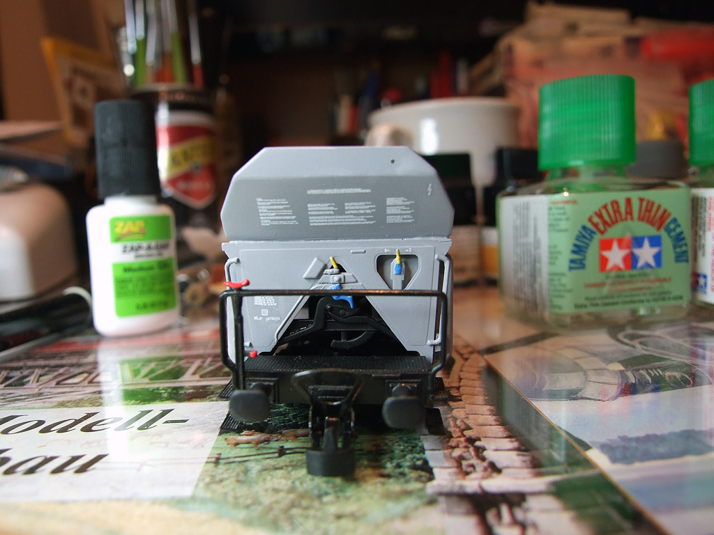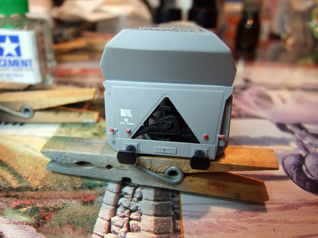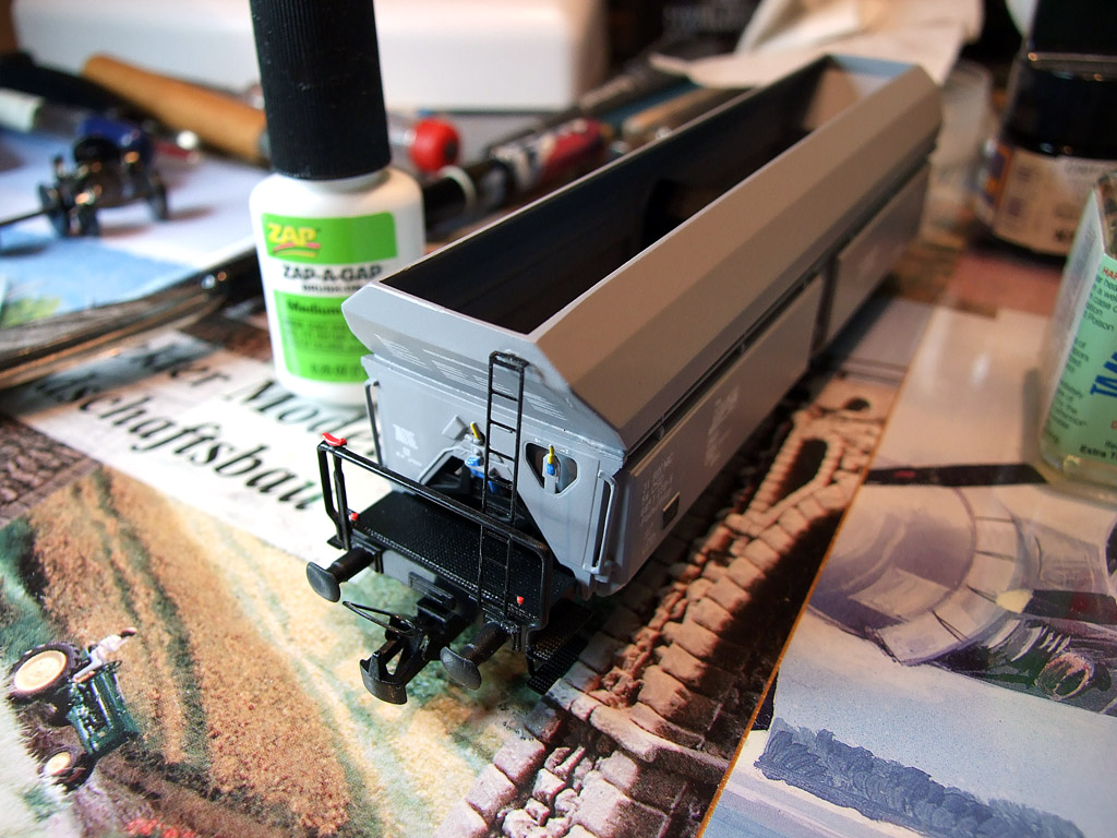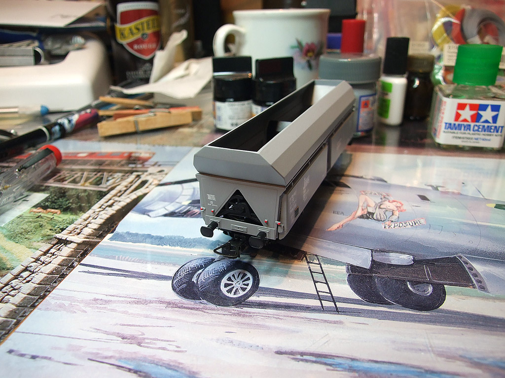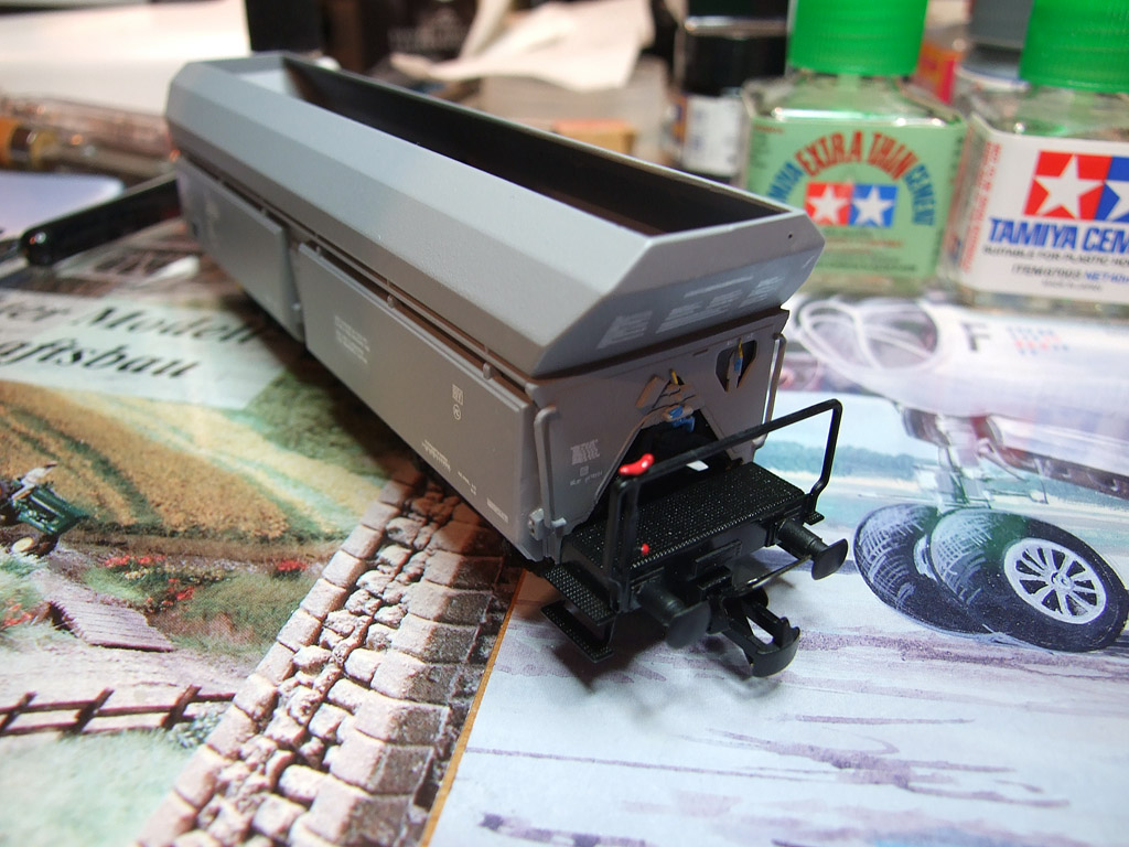jsem přilepil čelník se zábradlím. Z leptaného kovu jsem vytvaroval schůdky, které jsem přilepil zespodu k brzdařské plošině. Jako závaží jsou ve stavebnici přiloženy matky M8. 🙂 Tyto matky jsem také přilepil k šasi podvozku. Celé šasi podvozku a leptaný žebřík jsem nastříkal černou barvou Gunze Semi Gloss Black 92 a výsypné mechanizmy klapek černou barvou Gunze Flat Black 33. Výsypné mechanizmy klapek jsem přilepil do karosérie a na karosérii jsem aplikoval obtisky. Po zaschnutí barvy na šasi podvozku jsem na něj nasadil nárazníky, kinematiky a dvouosé podvozky. Celý tento komplet jsem přilepil na karosérii vozu. Mezi brzdařskou plošinu a karosérii jsem přilepil leptaný žebřík a nasadil dvoukolí do podvozků. Celý vůz jsem nakonec nastříkal pololesklým lakem Gunze 181. Podrobněji vysvětlím u fotek.