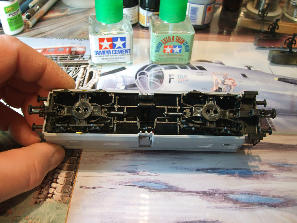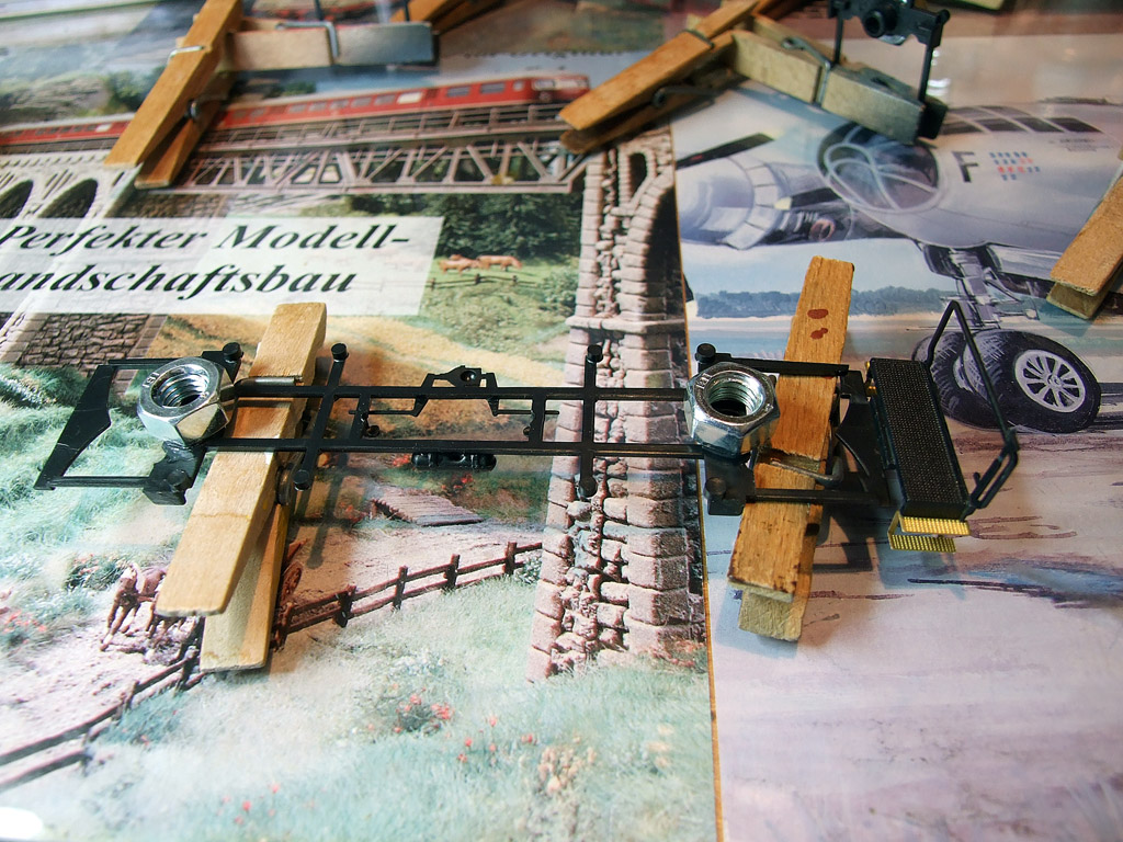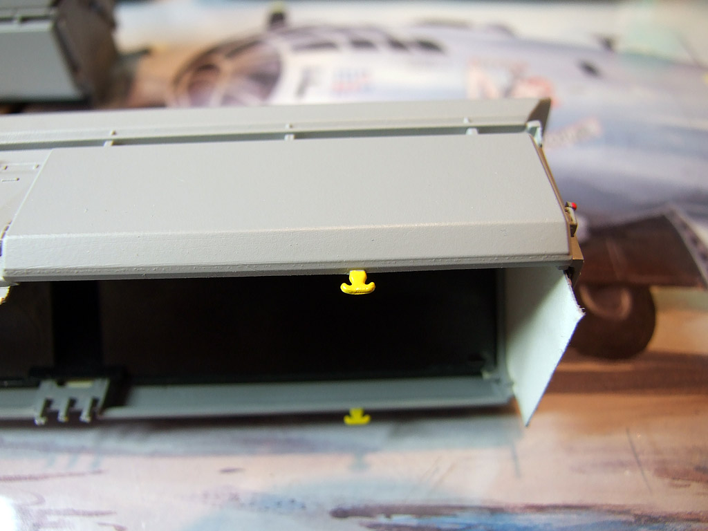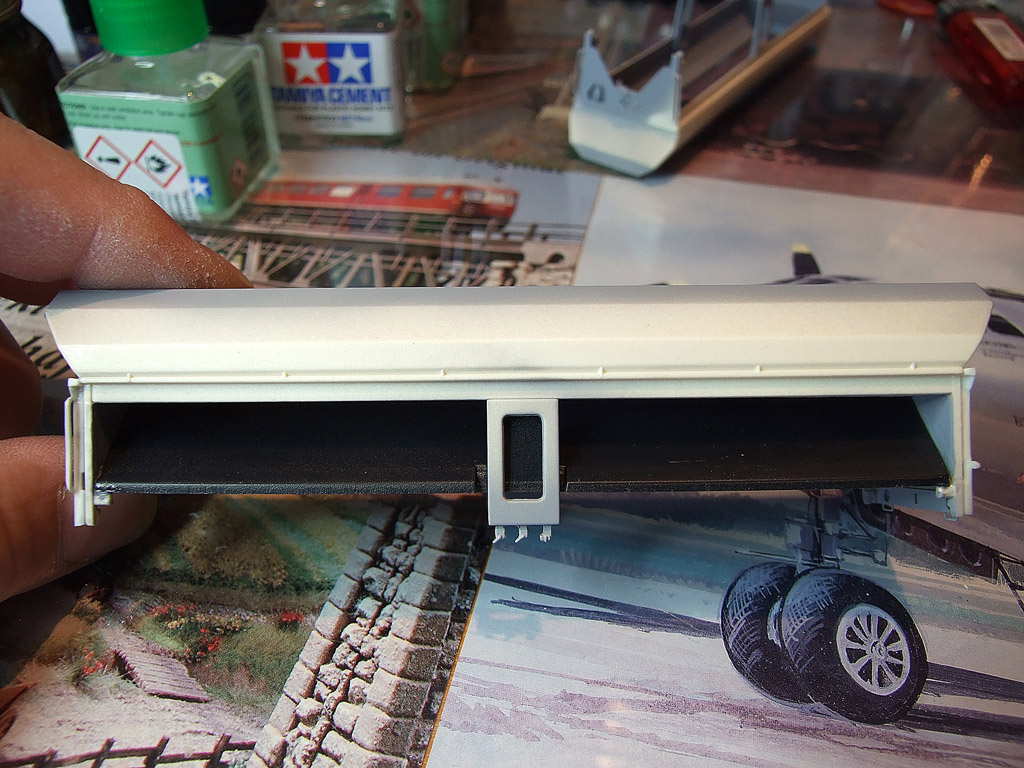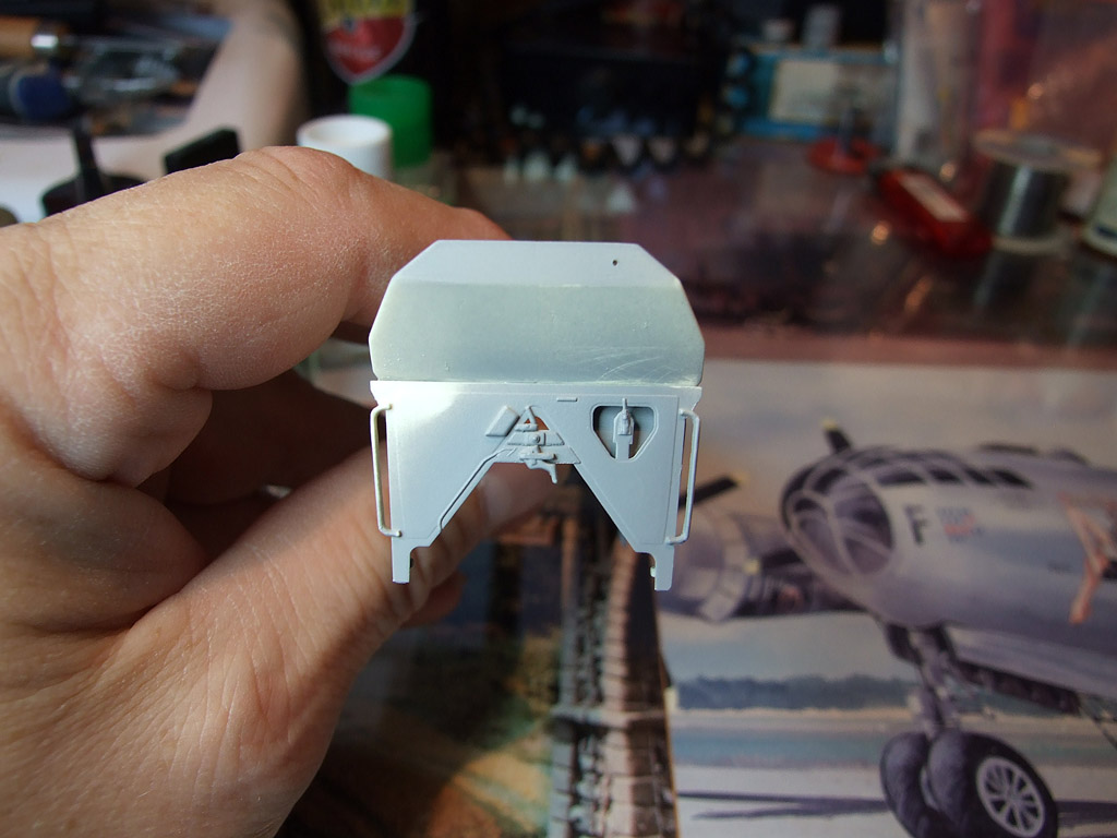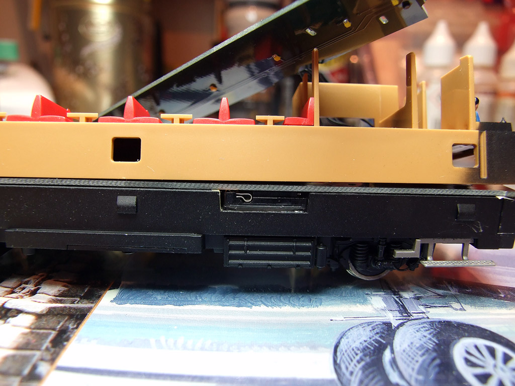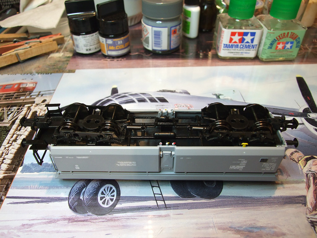 jsem přilepil čelník se zábradlím. Z leptaného kovu jsem vytvaroval schůdky, které jsem přilepil zespodu k brzdařské plošině. Jako závaží jsou ve stavebnici přiloženy matky M8. 🙂 Tyto matky jsem také přilepil k šasi podvozku. Celé šasi podvozku a leptaný žebřík jsem nastříkal černou barvou Gunze Semi Gloss Black 92 a výsypné mechanizmy klapek černou barvou Gunze Flat Black 33. Výsypné mechanizmy klapek jsem přilepil do karosérie a na karosérii jsem aplikoval obtisky. Po zaschnutí barvy na šasi podvozku jsem na něj nasadil nárazníky, kinematiky a dvouosé podvozky. Celý tento komplet jsem přilepil na karosérii vozu. Mezi brzdařskou plošinu a karosérii jsem přilepil leptaný žebřík a nasadil dvoukolí do podvozků. Celý vůz jsem nakonec nastříkal pololesklým lakem Gunze 181. Podrobněji vysvětlím u fotek.