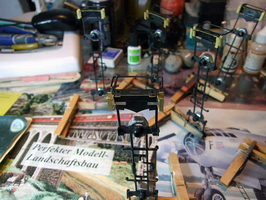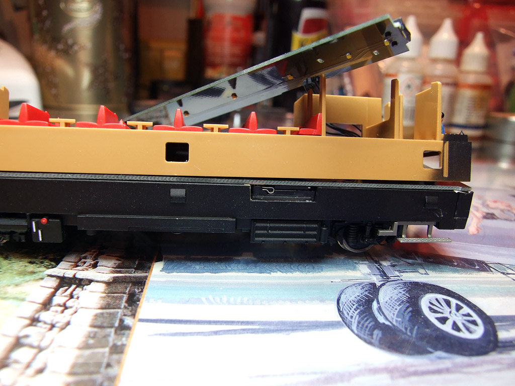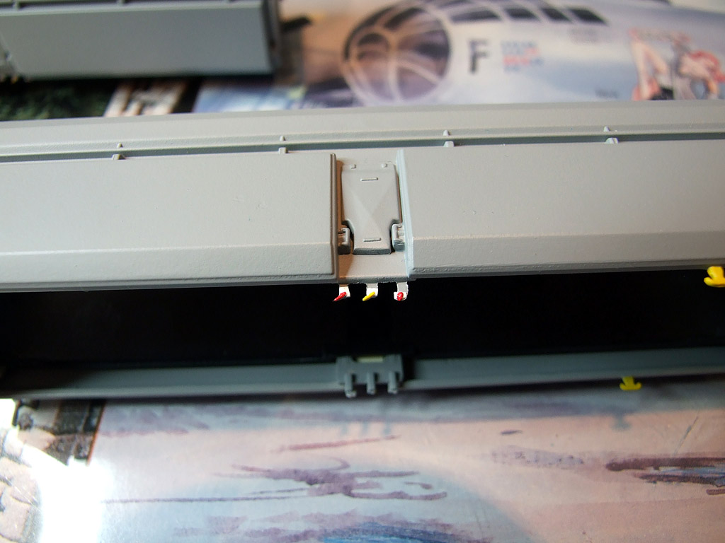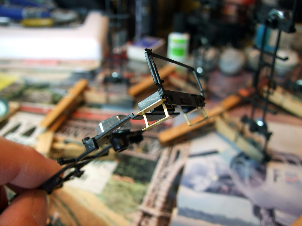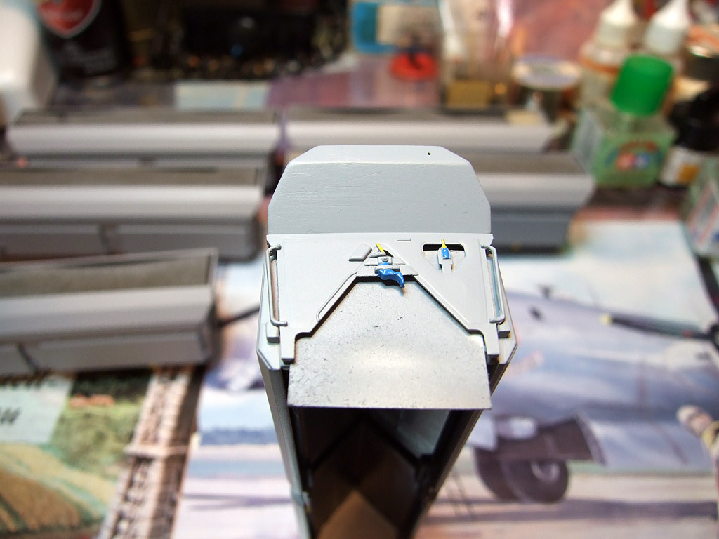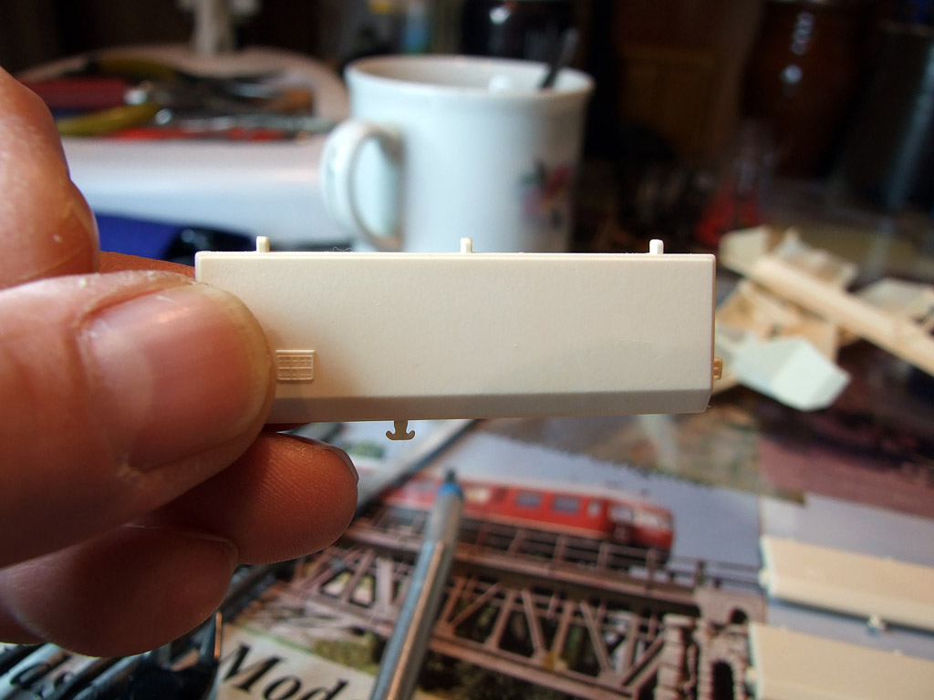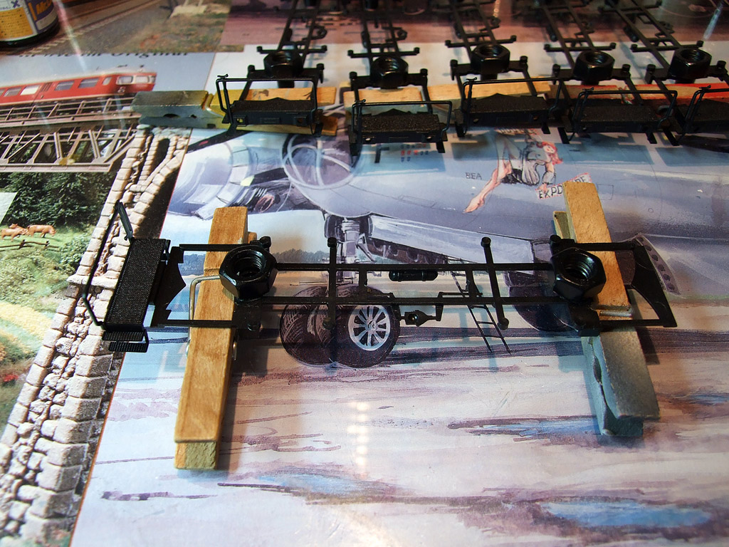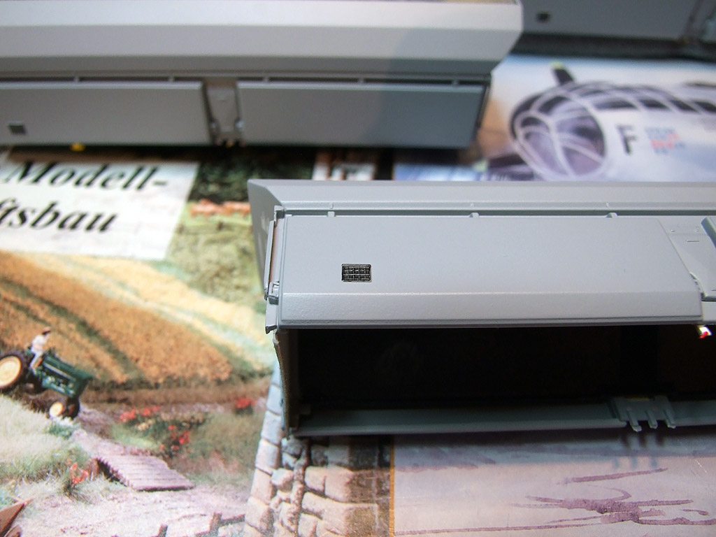 jsem přilepil čelník se zábradlím. Z leptaného kovu jsem vytvaroval schůdky, které jsem přilepil zespodu k brzdařské plošině. Jako závaží jsou ve stavebnici přiloženy matky M8. 🙂 Tyto matky jsem také přilepil k šasi podvozku. Celé šasi podvozku a leptaný žebřík jsem nastříkal černou barvou Gunze Semi Gloss Black 92 a výsypné mechanizmy klapek černou barvou Gunze Flat Black 33. Výsypné mechanizmy klapek jsem přilepil do karosérie a na karosérii jsem aplikoval obtisky. Po zaschnutí barvy na šasi podvozku jsem na něj nasadil nárazníky, kinematiky a dvouosé podvozky. Celý tento komplet jsem přilepil na karosérii vozu. Mezi brzdařskou plošinu a karosérii jsem přilepil leptaný žebřík a nasadil dvoukolí do podvozků. Celý vůz jsem nakonec nastříkal pololesklým lakem Gunze 181. Podrobněji vysvětlím u fotek.