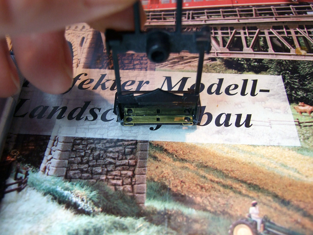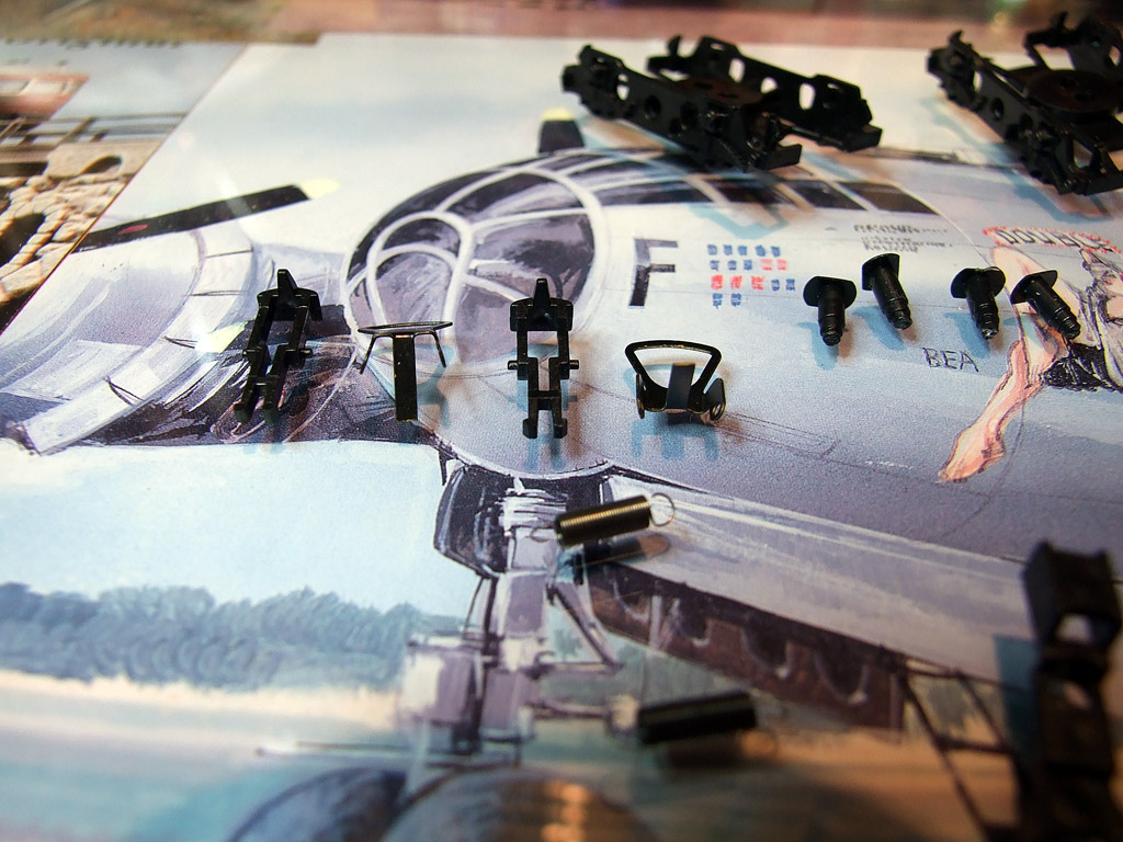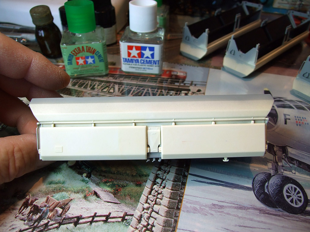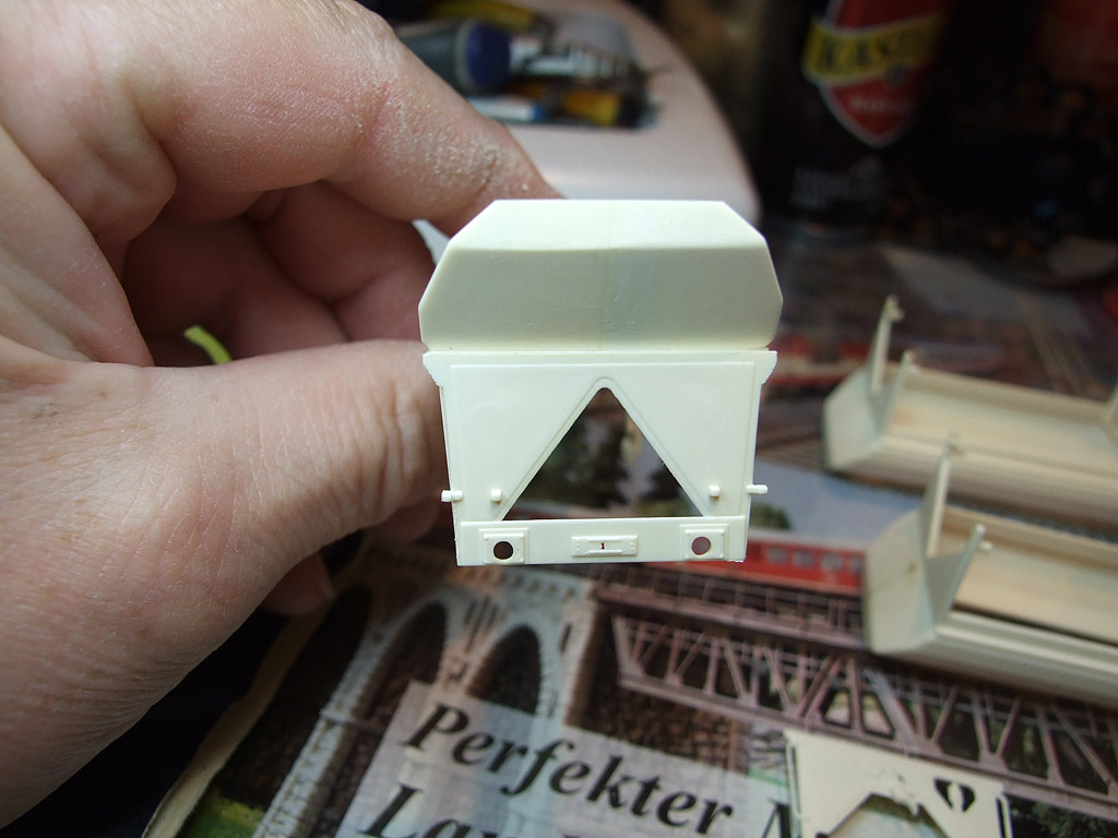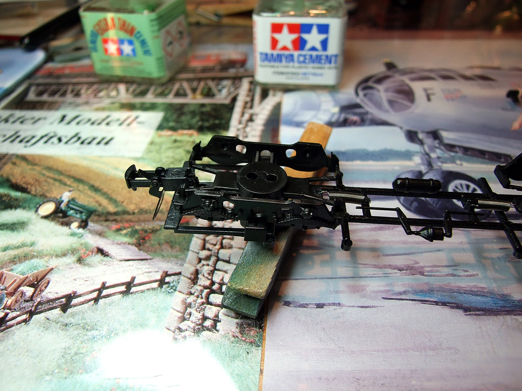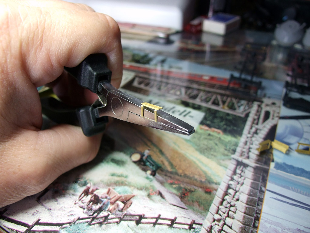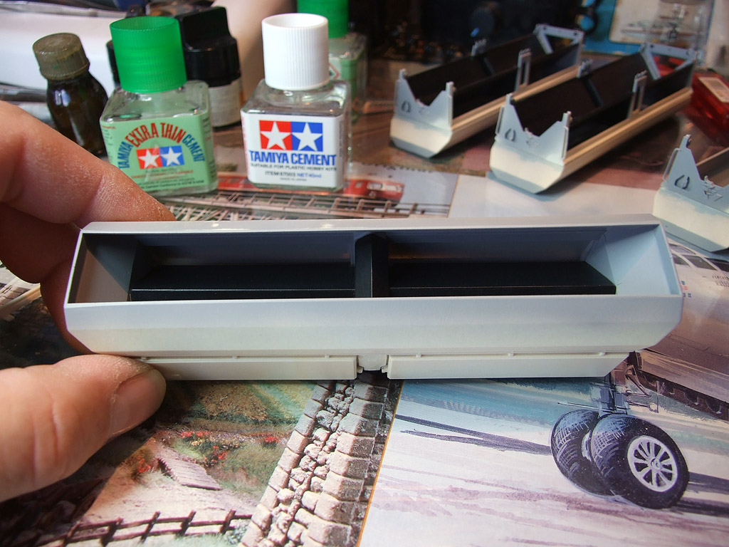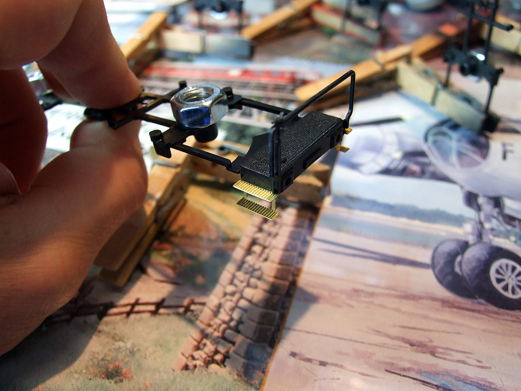 jsem přilepil čelník se zábradlím. Z leptaného kovu jsem vytvaroval schůdky, které jsem přilepil zespodu k brzdařské plošině. Jako závaží jsou ve stavebnici přiloženy matky M8. 🙂 Tyto matky jsem také přilepil k šasi podvozku. Celé šasi podvozku a leptaný žebřík jsem nastříkal černou barvou Gunze Semi Gloss Black 92 a výsypné mechanizmy klapek černou barvou Gunze Flat Black 33. Výsypné mechanizmy klapek jsem přilepil do karosérie a na karosérii jsem aplikoval obtisky. Po zaschnutí barvy na šasi podvozku jsem na něj nasadil nárazníky, kinematiky a dvouosé podvozky. Celý tento komplet jsem přilepil na karosérii vozu. Mezi brzdařskou plošinu a karosérii jsem přilepil leptaný žebřík a nasadil dvoukolí do podvozků. Celý vůz jsem nakonec nastříkal pololesklým lakem Gunze 181. Podrobněji vysvětlím u fotek.