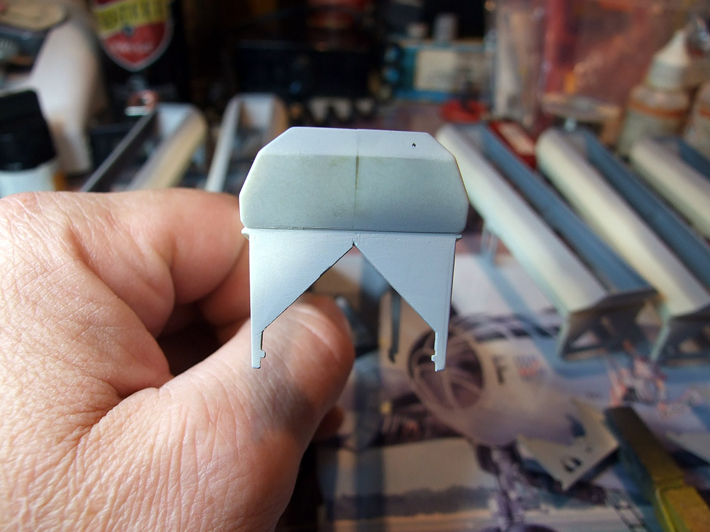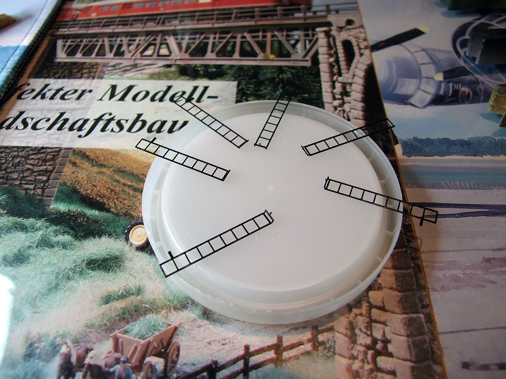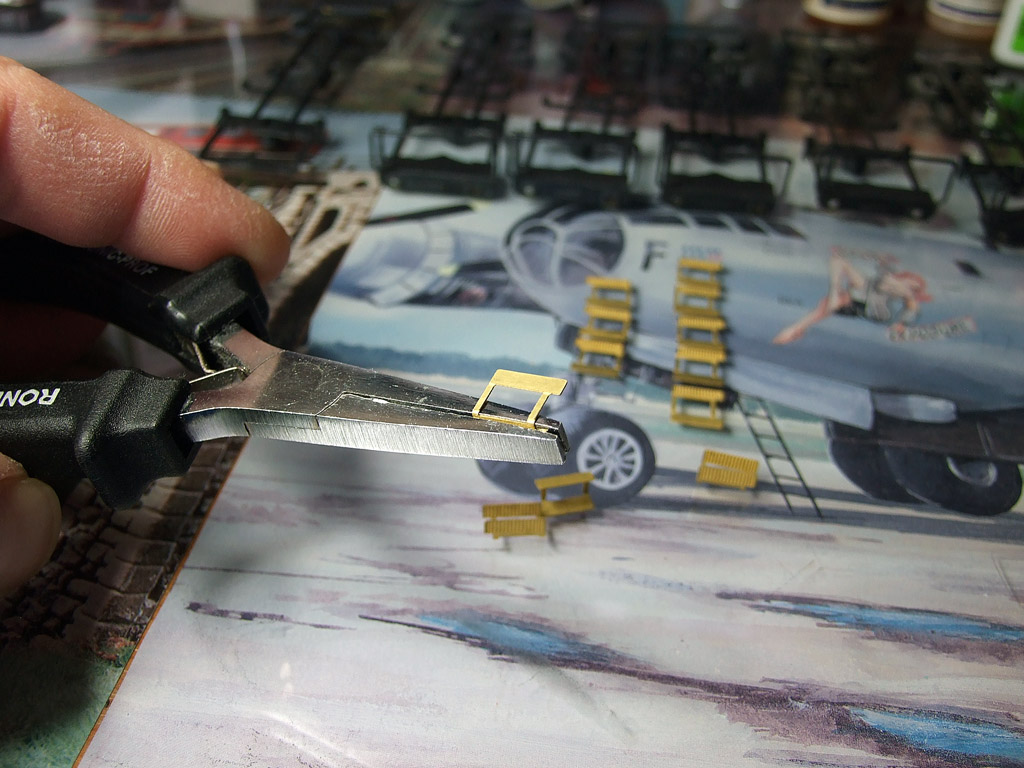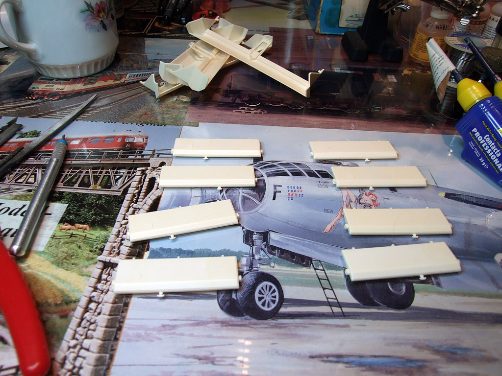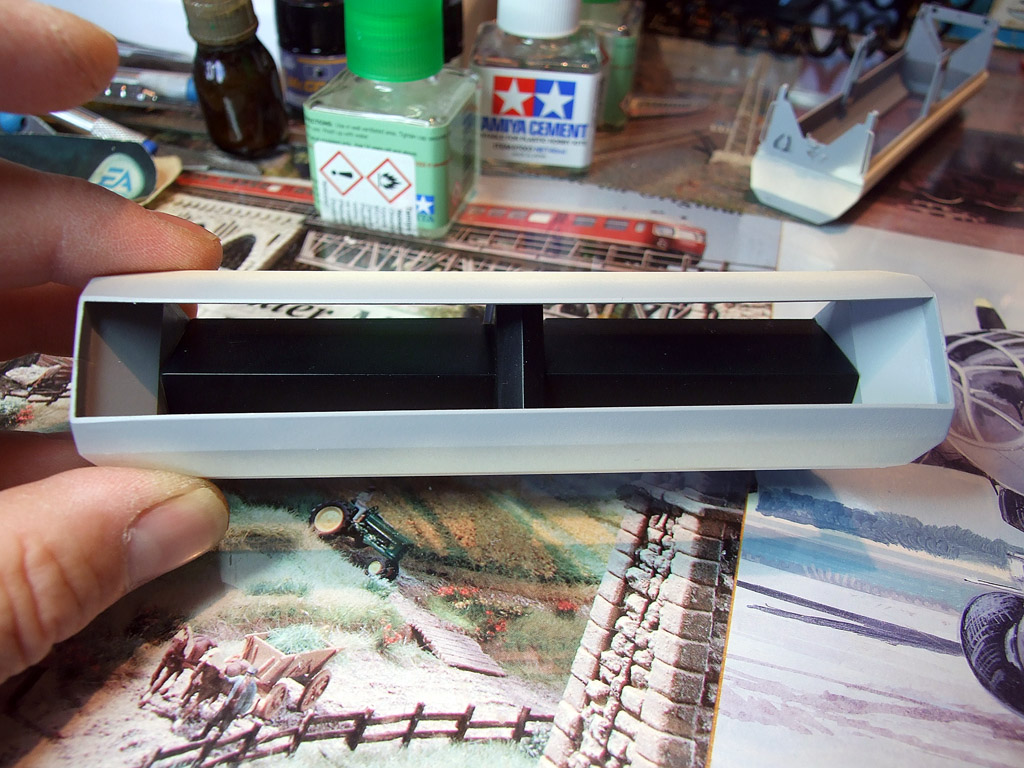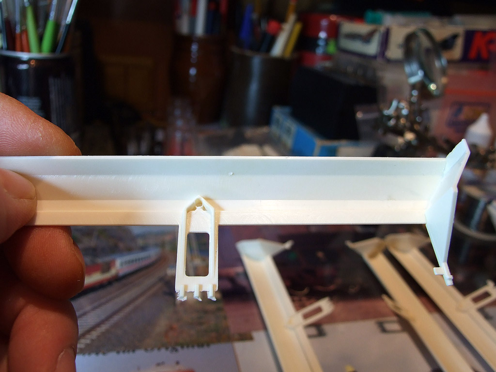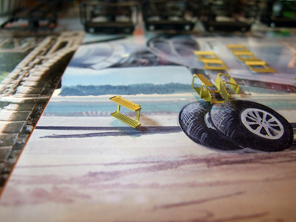 jsem přilepil čelník se zábradlím. Z leptaného kovu jsem vytvaroval schůdky, které jsem přilepil zespodu k brzdařské plošině. Jako závaží jsou ve stavebnici přiloženy matky M8. 🙂 Tyto matky jsem také přilepil k šasi podvozku. Celé šasi podvozku a leptaný žebřík jsem nastříkal černou barvou Gunze Semi Gloss Black 92 a výsypné mechanizmy klapek černou barvou Gunze Flat Black 33. Výsypné mechanizmy klapek jsem přilepil do karosérie a na karosérii jsem aplikoval obtisky. Po zaschnutí barvy na šasi podvozku jsem na něj nasadil nárazníky, kinematiky a dvouosé podvozky. Celý tento komplet jsem přilepil na karosérii vozu. Mezi brzdařskou plošinu a karosérii jsem přilepil leptaný žebřík a nasadil dvoukolí do podvozků. Celý vůz jsem nakonec nastříkal pololesklým lakem Gunze 181. Podrobněji vysvětlím u fotek.