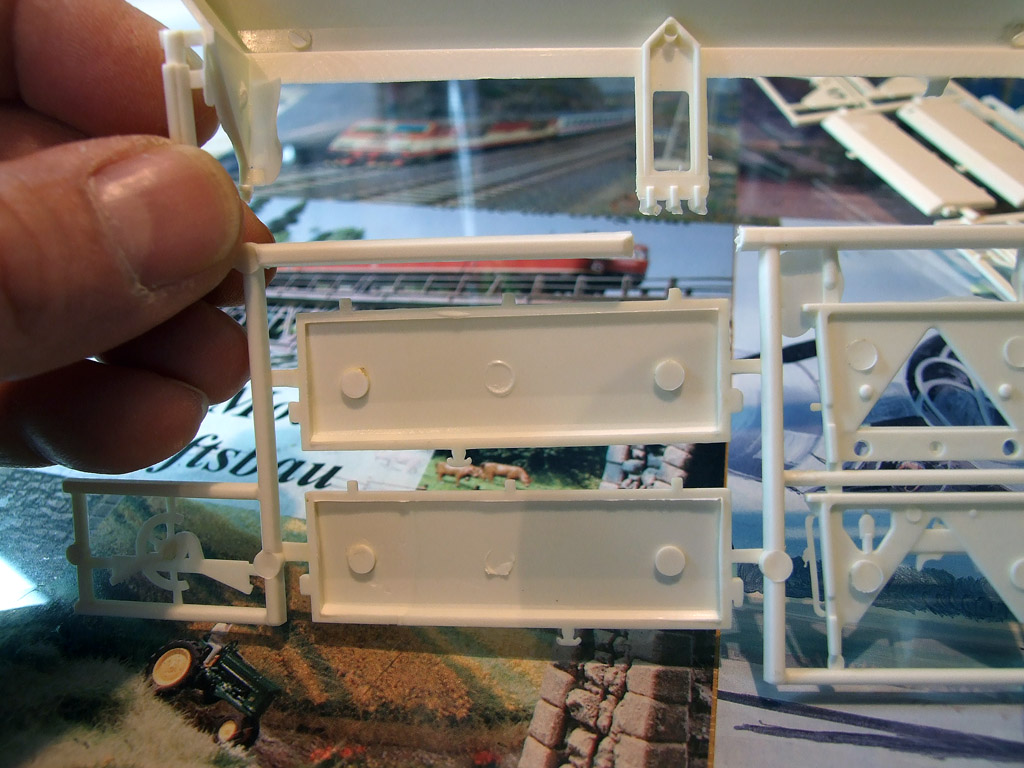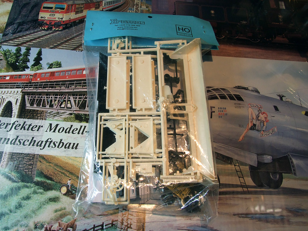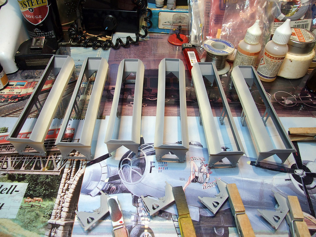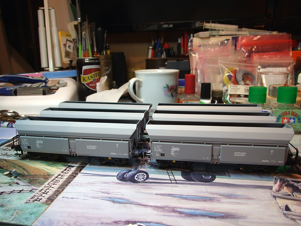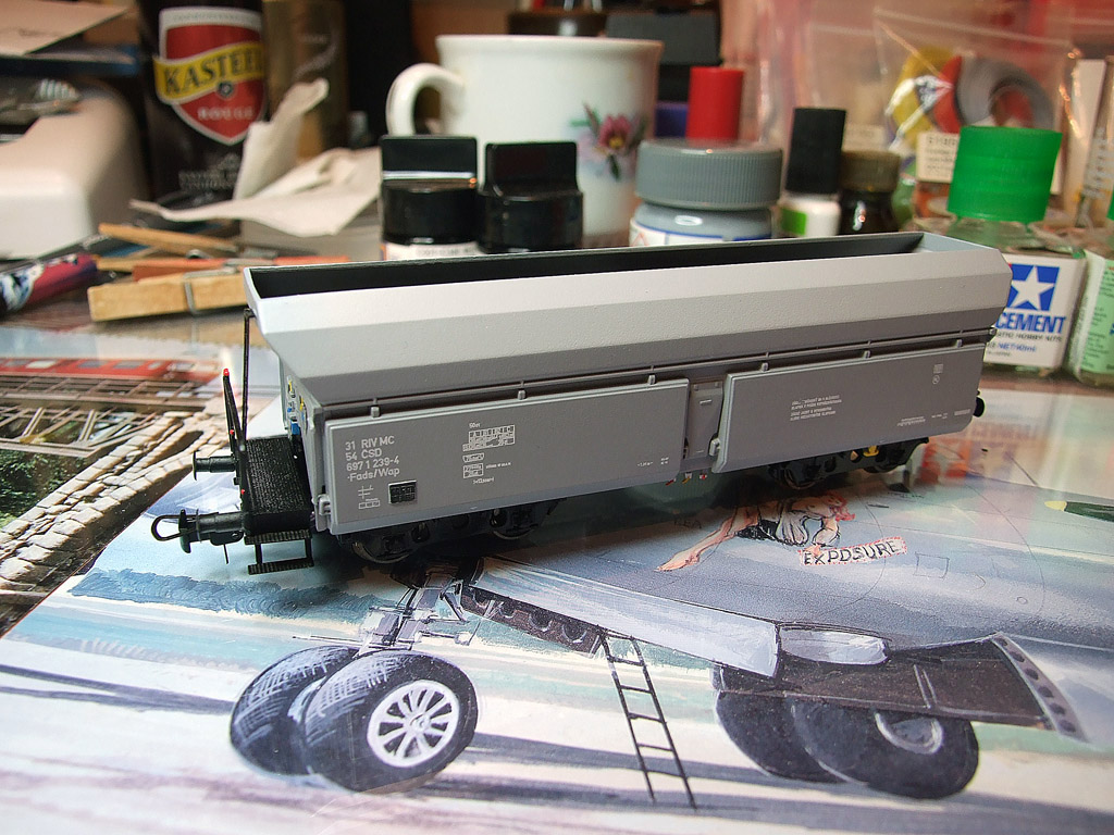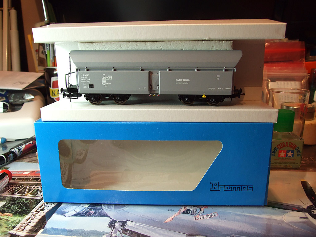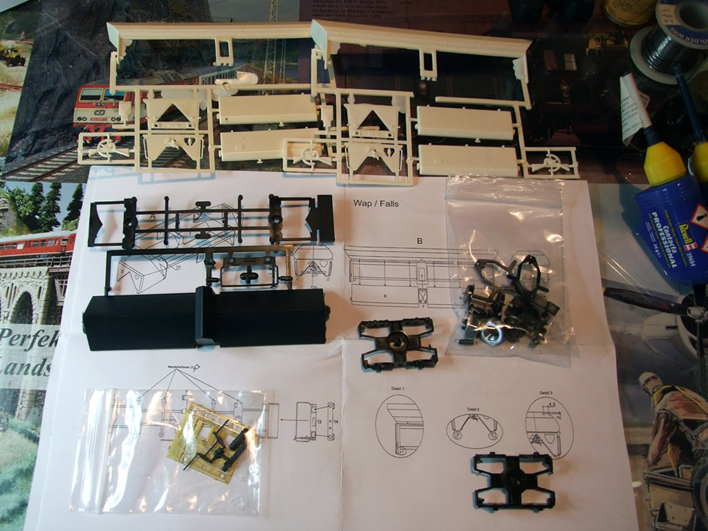 Před časem jsem si koupil stavebnice vozů Falls/Wap od firmy Bramos, takže jsem se pustil do jejich stavby. Ve stavebnici jsou všechny díly na sestavení jednoho vozu, včetně dvojkolí, spřáhel atd. Ke stavebnicím jsem si dokoupil ještě obtisky a krabičky, taky od firmy Bramos. Stavebnice bohužel není moc dobrá, všude jsou otřepy, stopy po vyhazovačích a nálitky. Na šasi podvozku jsou části, které nejsou dolity, nebo tam chybí úplně, především se jedná o háčky pro pružinu kinematiky. Z mých šesti kusů stavebnic byly pouze u dvou šasi podvozku háčky dolity. Největší chyba stavebnice je, že jedna půlka karosérie je slabší a druhá silnější, takže po slepení vzniká velká nerovnost mezi oběma půlkami karosérie. Vzhledem k tomu, že jsem měl šest stavebnic, vyřešil jsem tento problém tak, že jsem rozdělil půlky karosérií na slabší a silnější a lepil jsem je k sobě tak, aby vždy byly obě stejné. Před tím než jsem vůbec začal něco lepit, musel jsem očistit všechny díly od otřepů a nálitků, což mi tedy zabralo dost času. Nejdříve jsem slepil půlky karosérií, ke kterým jsem přilepil tu boční část, kde není plošina pro posunovače. Druhou boční část jsem zatím nelepil. Potom jsem nepřilepenou boční část, karosérii a výsypné klapky nastříkal z vnitřní části šedivou barvou Gunze SF-284. Po zaschnutí barvy jsem přilepil ke karosérii druhou boční část, kde je plošina pro posunovače. Do takto hotové karosérie jsem vlepil černý díl V (výsypná podlaha vozu). Pak jsem přilepil výsypné klapky a středový krycí díl mezi nimi. Takto připravenou karosérii jsem nastříkal z vnější strany šedivou barvou Gunze SF-284 a domaloval detaily (podrobnější popis u fotek). Po hotové karosérii přišel na řadu podvozek. Na spodní část šasi podvozku jsem přilepil imitaci vzduchojemu a brzdového válce,  k  brzdařské  plošině