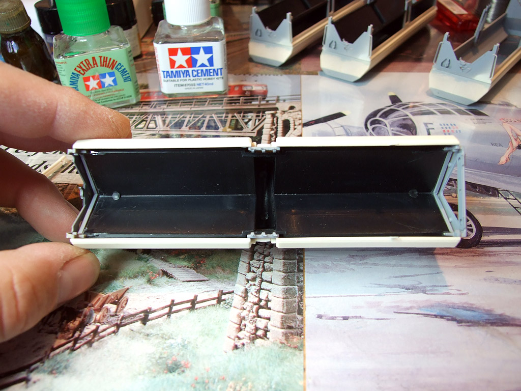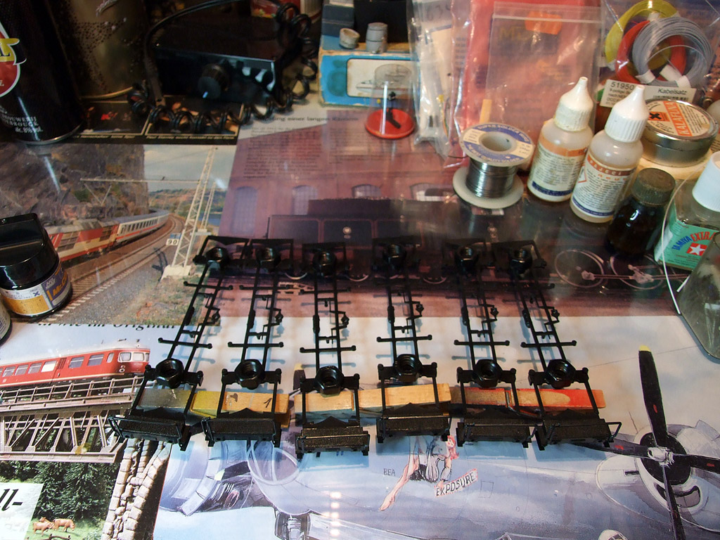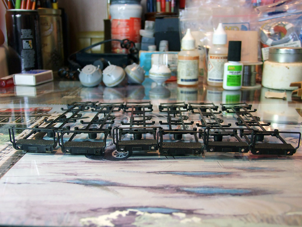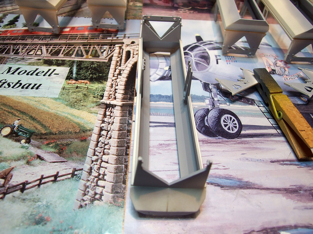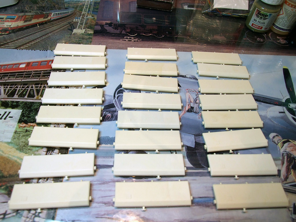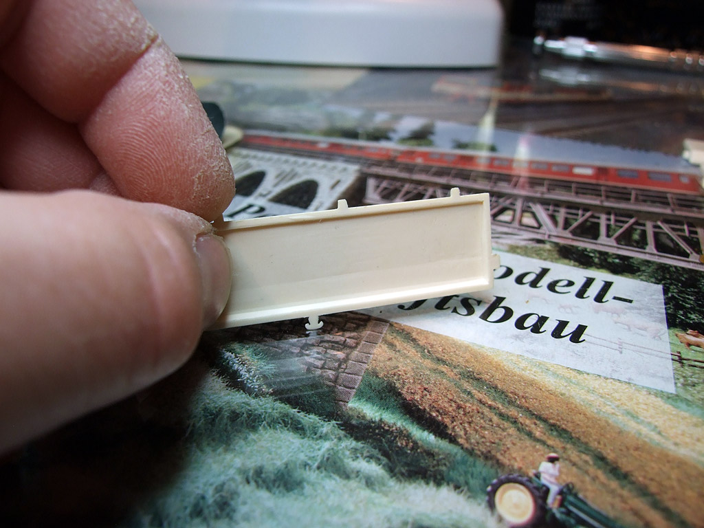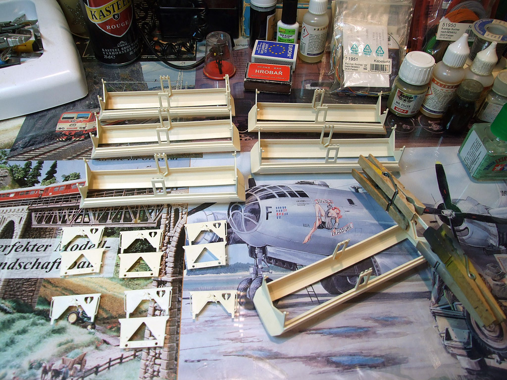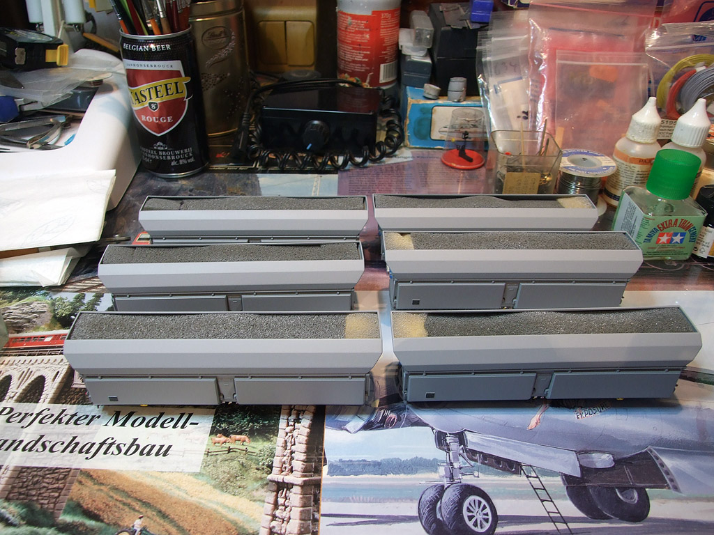 Před časem jsem si koupil stavebnice vozů Falls/Wap od firmy Bramos, takže jsem se pustil do jejich stavby. Ve stavebnici jsou všechny díly na sestavení jednoho vozu, včetně dvojkolí, spřáhel atd. Ke stavebnicím jsem si dokoupil ještě obtisky a krabičky, taky od firmy Bramos. Stavebnice bohužel není moc dobrá, všude jsou otřepy, stopy po vyhazovačích a nálitky. Na šasi podvozku jsou části, které nejsou dolity, nebo tam chybí úplně, především se jedná o háčky pro pružinu kinematiky. Z mých šesti kusů stavebnic byly pouze u dvou šasi podvozku háčky dolity. Největší chyba stavebnice je, že jedna půlka karosérie je slabší a druhá silnější, takže po slepení vzniká velká nerovnost mezi oběma půlkami karosérie. Vzhledem k tomu, že jsem měl šest stavebnic, vyřešil jsem tento problém tak, že jsem rozdělil půlky karosérií na slabší a silnější a lepil jsem je k sobě tak, aby vždy byly obě stejné. Před tím než jsem vůbec začal něco lepit, musel jsem očistit všechny díly od otřepů a nálitků, což mi tedy zabralo dost času. Nejdříve jsem slepil půlky karosérií, ke kterým jsem přilepil tu boční část, kde není plošina pro posunovače. Druhou boční část jsem zatím nelepil. Potom jsem nepřilepenou boční část, karosérii a výsypné klapky nastříkal z vnitřní části šedivou barvou Gunze SF-284. Po zaschnutí barvy jsem přilepil ke karosérii druhou boční část, kde je plošina pro posunovače. Do takto hotové karosérie jsem vlepil černý díl V (výsypná podlaha vozu). Pak jsem přilepil výsypné klapky a středový krycí díl mezi nimi. Takto připravenou karosérii jsem nastříkal z vnější strany šedivou barvou Gunze SF-284 a domaloval detaily (podrobnější popis u fotek). Po hotové karosérii přišel na řadu podvozek. Na spodní část šasi podvozku jsem přilepil imitaci vzduchojemu a brzdového válce,  k  brzdařské  plošině