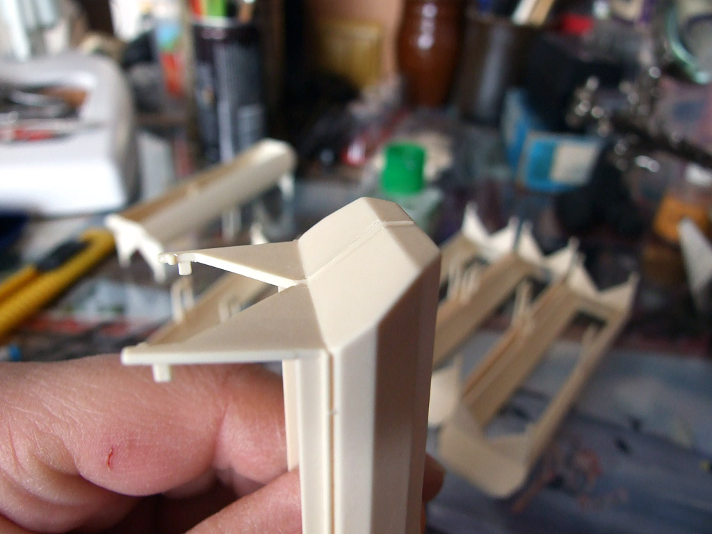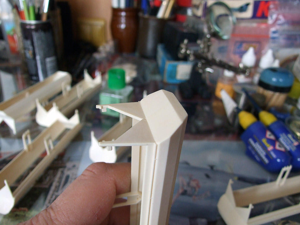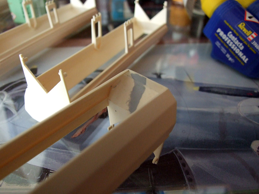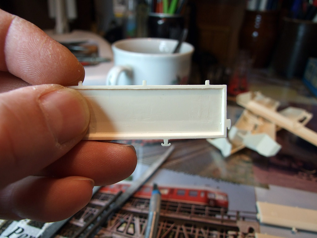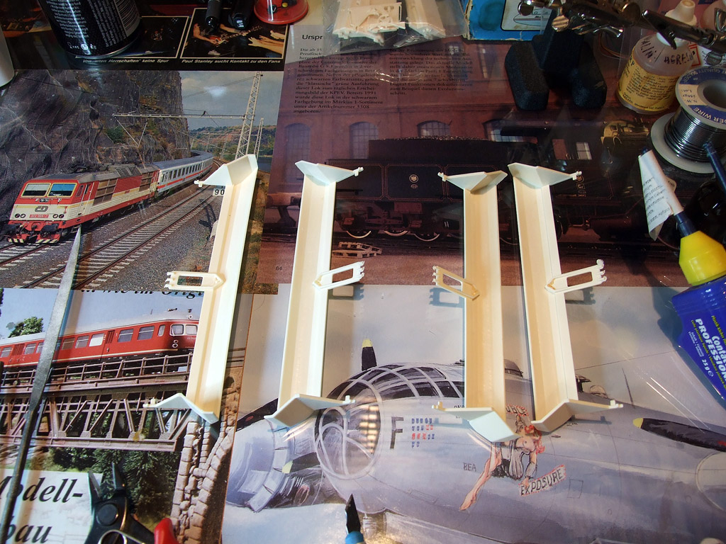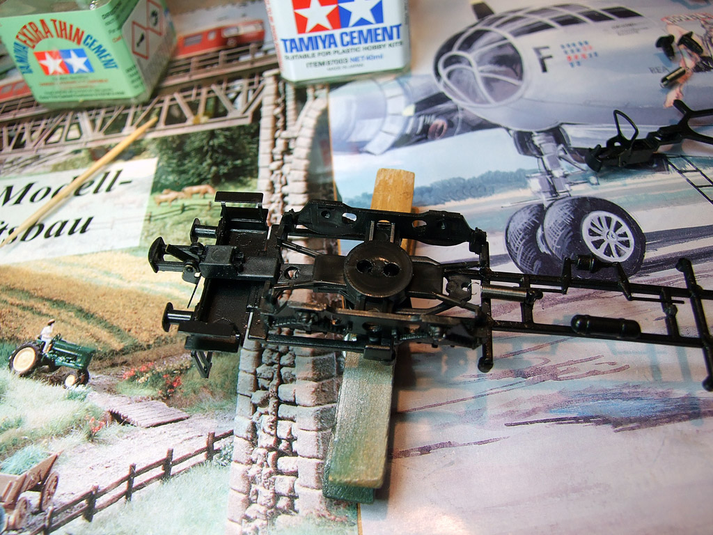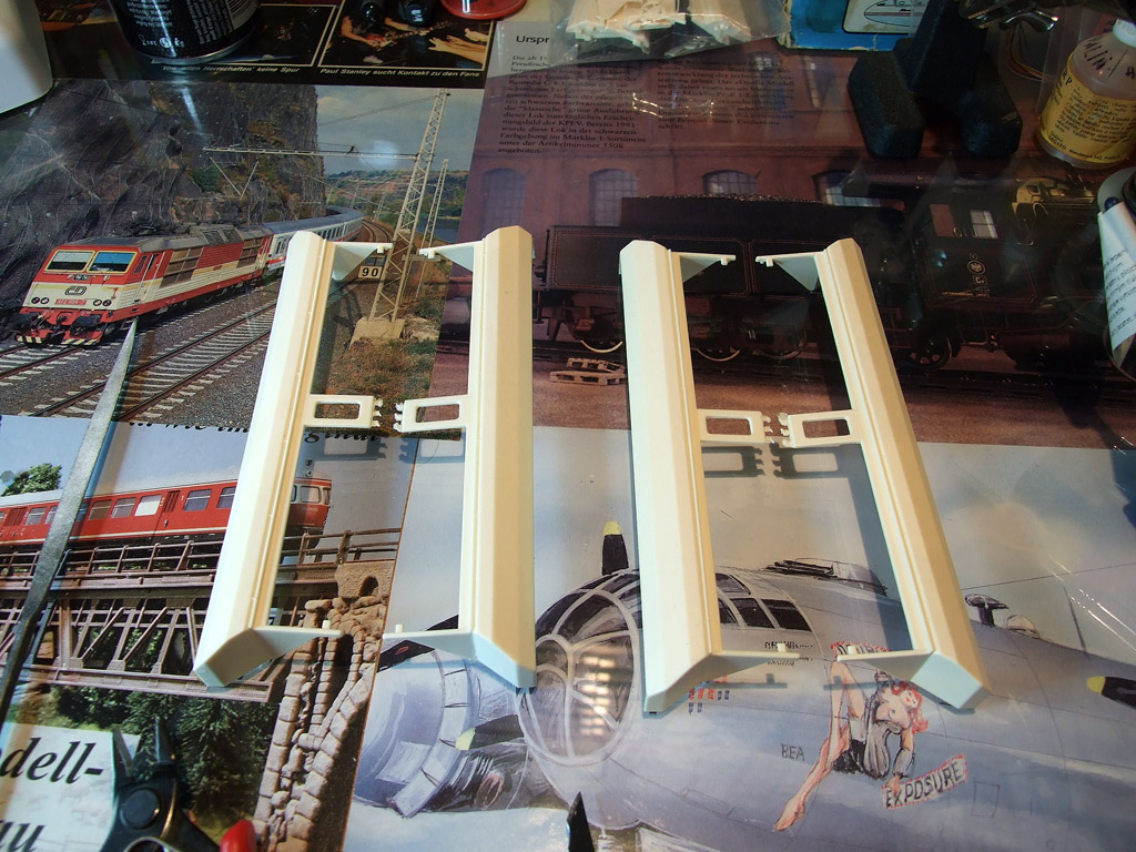 Před časem jsem si koupil stavebnice vozů Falls/Wap od firmy Bramos, takže jsem se pustil do jejich stavby. Ve stavebnici jsou všechny díly na sestavení jednoho vozu, včetně dvojkolí, spřáhel atd. Ke stavebnicím jsem si dokoupil ještě obtisky a krabičky, taky od firmy Bramos. Stavebnice bohužel není moc dobrá, všude jsou otřepy, stopy po vyhazovačích a nálitky. Na šasi podvozku jsou části, které nejsou dolity, nebo tam chybí úplně, především se jedná o háčky pro pružinu kinematiky. Z mých šesti kusů stavebnic byly pouze u dvou šasi podvozku háčky dolity. Největší chyba stavebnice je, že jedna půlka karosérie je slabší a druhá silnější, takže po slepení vzniká velká nerovnost mezi oběma půlkami karosérie. Vzhledem k tomu, že jsem měl šest stavebnic, vyřešil jsem tento problém tak, že jsem rozdělil půlky karosérií na slabší a silnější a lepil jsem je k sobě tak, aby vždy byly obě stejné. Před tím než jsem vůbec začal něco lepit, musel jsem očistit všechny díly od otřepů a nálitků, což mi tedy zabralo dost času. Nejdříve jsem slepil půlky karosérií, ke kterým jsem přilepil tu boční část, kde není plošina pro posunovače. Druhou boční část jsem zatím nelepil. Potom jsem nepřilepenou boční část, karosérii a výsypné klapky nastříkal z vnitřní části šedivou barvou Gunze SF-284. Po zaschnutí barvy jsem přilepil ke karosérii druhou boční část, kde je plošina pro posunovače. Do takto hotové karosérie jsem vlepil černý díl V (výsypná podlaha vozu). Pak jsem přilepil výsypné klapky a středový krycí díl mezi nimi. Takto připravenou karosérii jsem nastříkal z vnější strany šedivou barvou Gunze SF-284 a domaloval detaily (podrobnější popis u fotek). Po hotové karosérii přišel na řadu podvozek. Na spodní část šasi podvozku jsem přilepil imitaci vzduchojemu a brzdového válce,  k  brzdařské  plošině