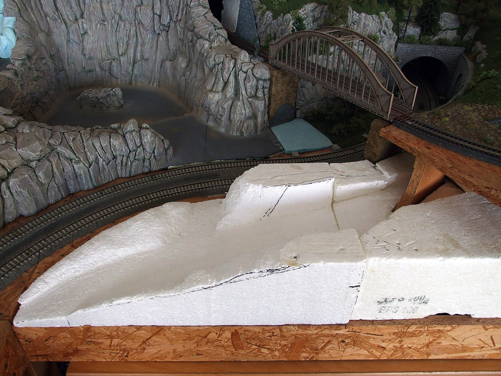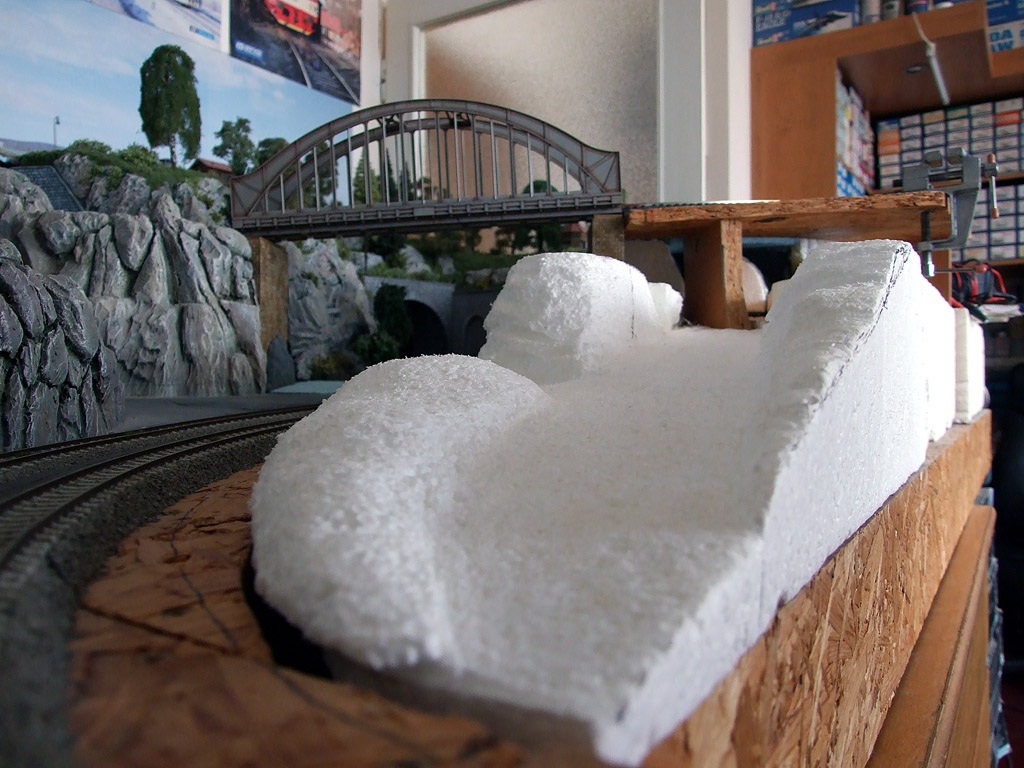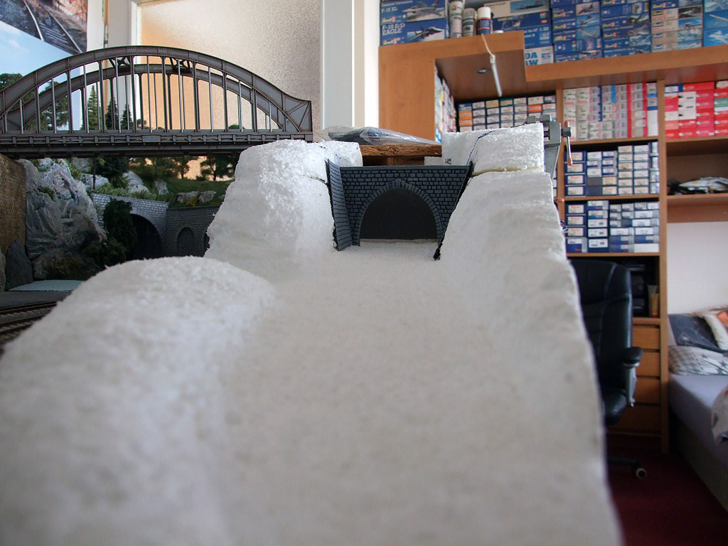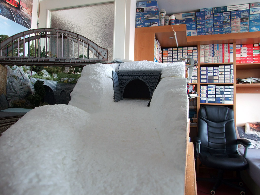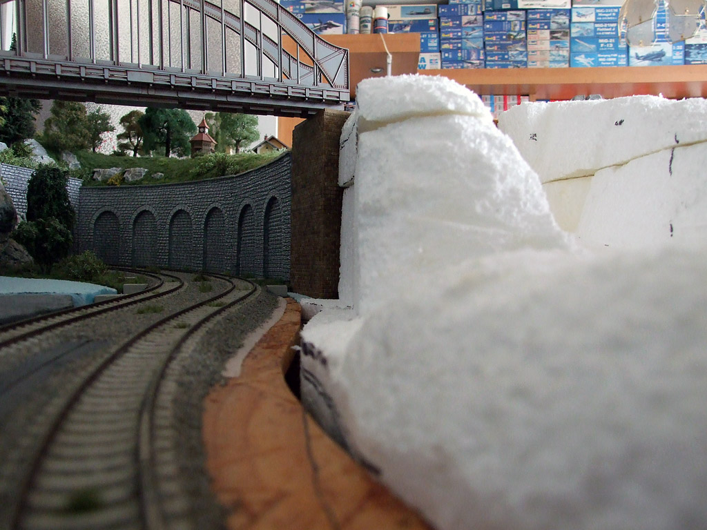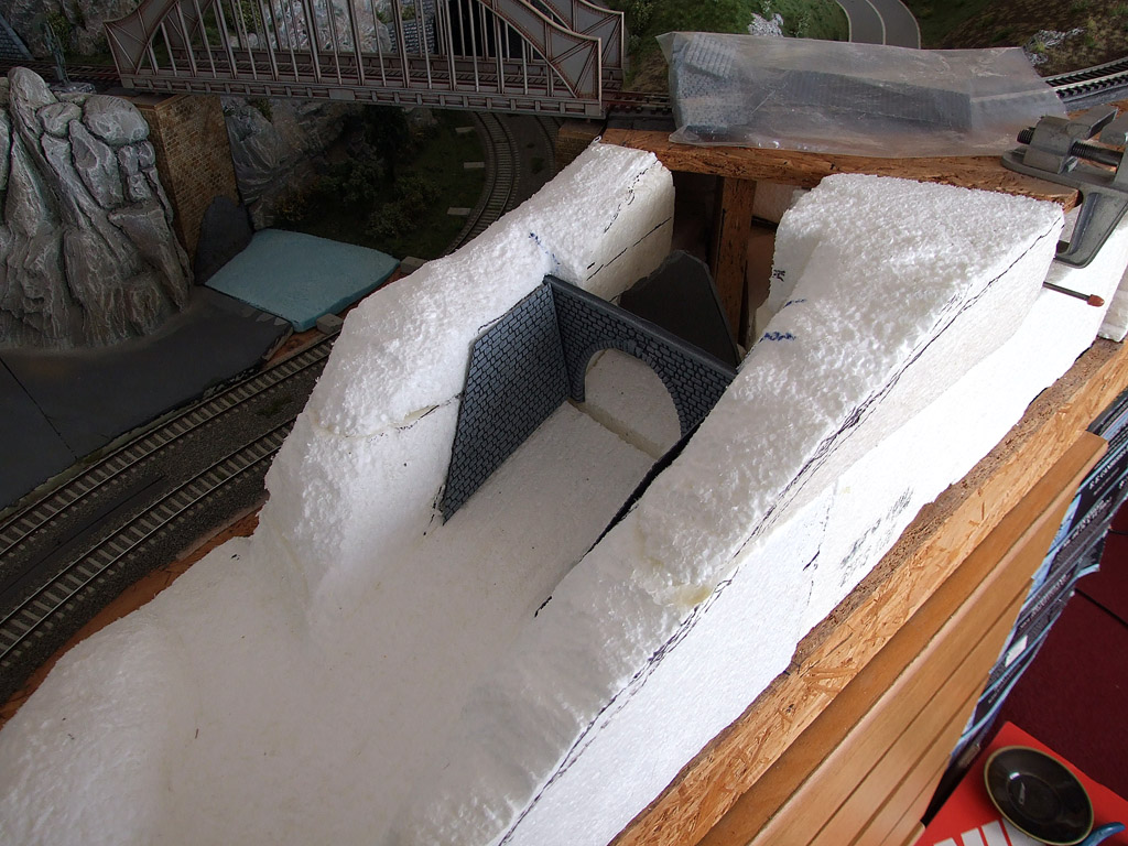 Ke konci roku jsem ještě vytvaroval terén na druhém konci silničního tunelu, kde silnice povede směrem dolů ke kolejím.